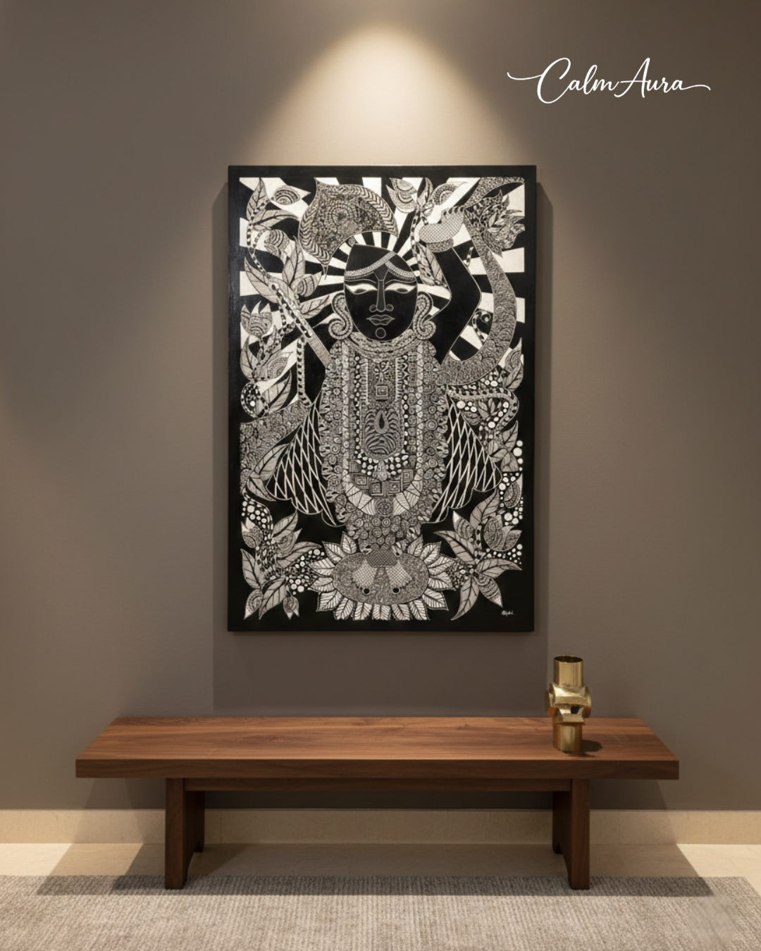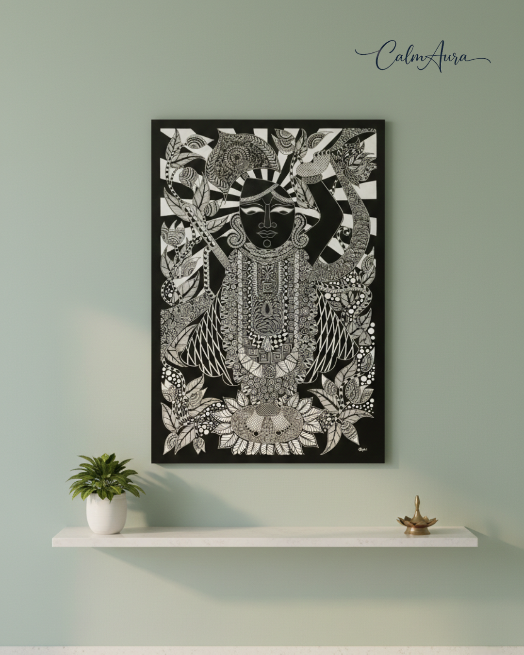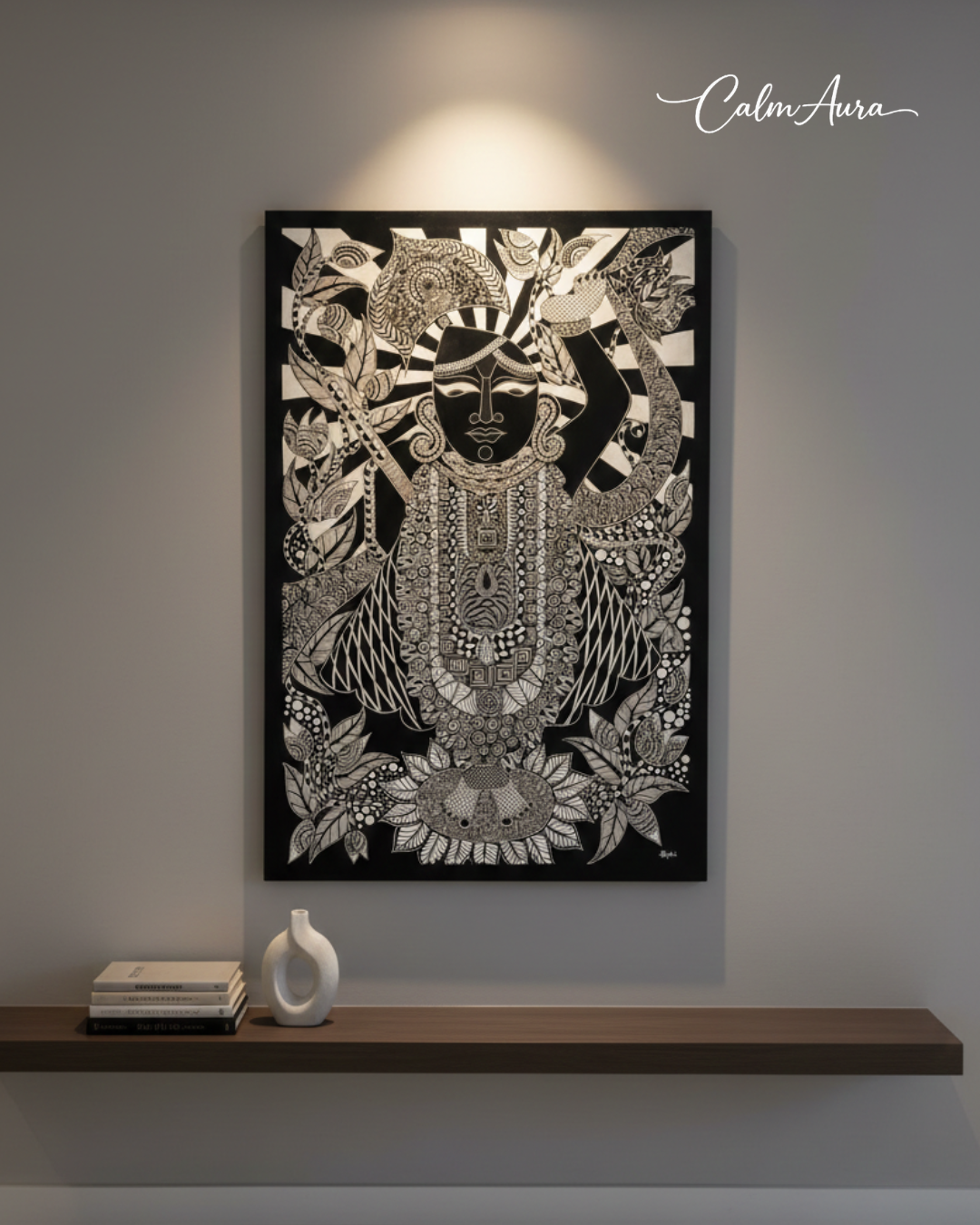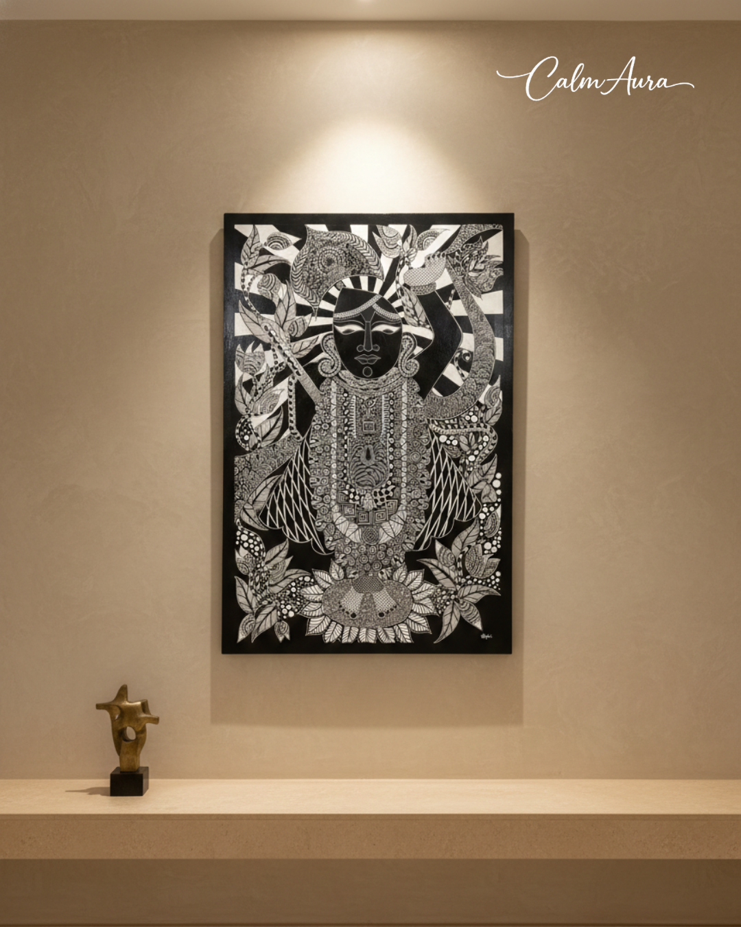 "Every line unfolds like a mantra, every motif echoes devotion. Mystic Radiance captures Shrinathji in a realm of stillness and strength — intricate, regal, and deeply meditative. The symmetry speaks of balance, the detailing reflects surrender, and the presence evokes unwavering faith. More than an artwork, it is a sanctified aura — where devotion transforms into design and radiance becomes eternal."